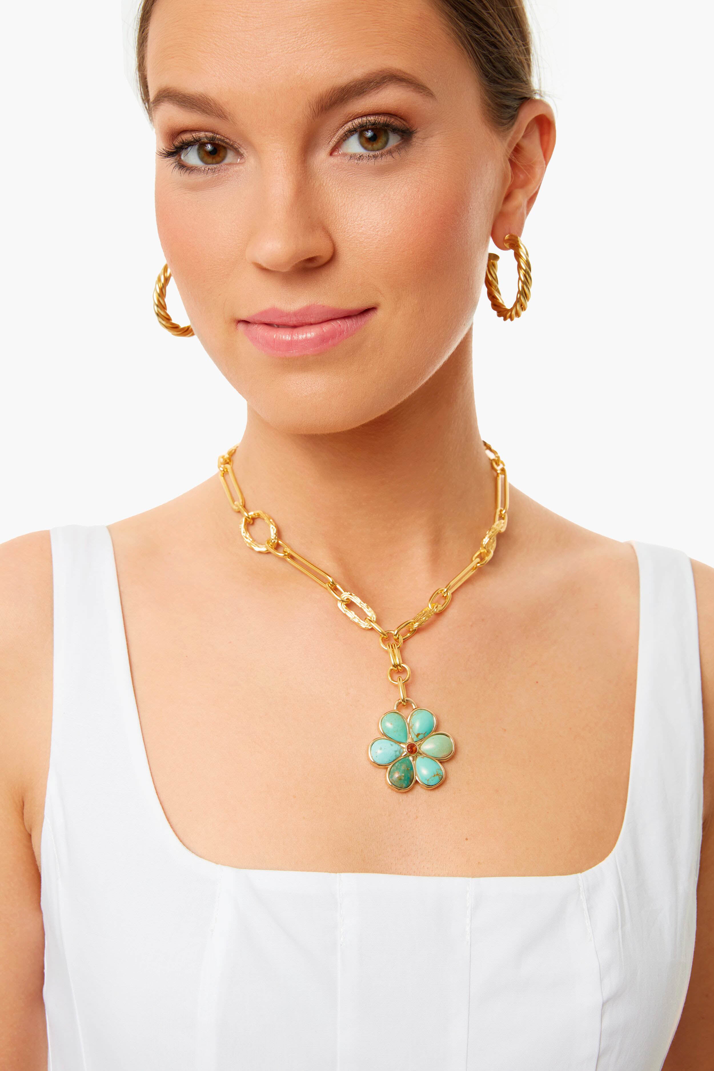 There's no chance of being called a wallflower in this statement-making gold-plated chain link necklace. With a cheerfully graphic 6-petal daisy pendant set with turquoise stones and faceted citrine cabochon. the Turquoise Desert Daisy Necklace is the perfect accent to all your looks this season!