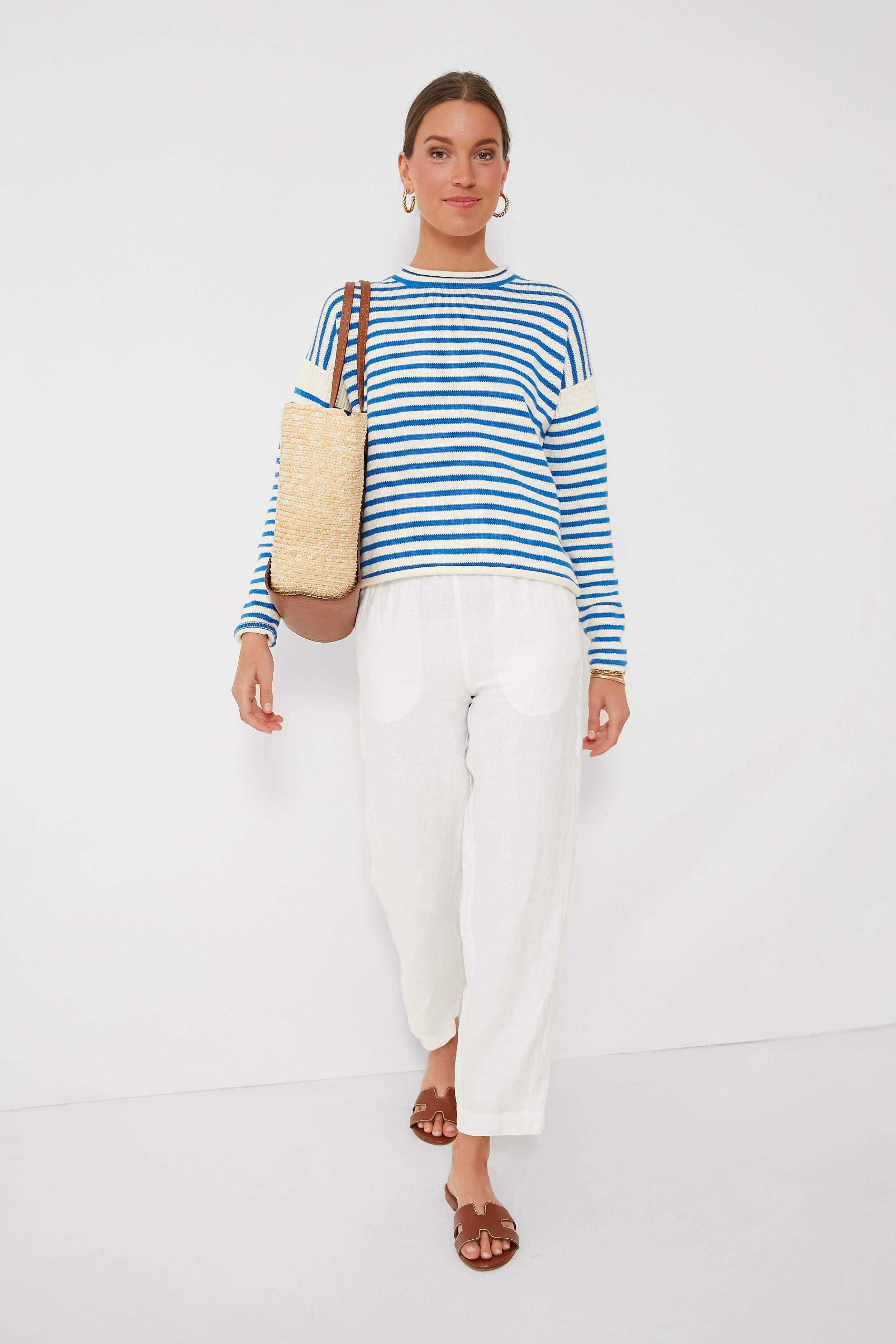 Vibrant stripes intensify the preppy style of the Ultramarine Ivory Mariner. Made from 100% cotton. this sweater is soft and comfortable. plus the roll neck and hem details add a casually polished finish that looks effortless and elevated at the same time. The perfect summer-weight sweater for chilly nights or throwing over your shoulders. we are constantly reaching for this piece.