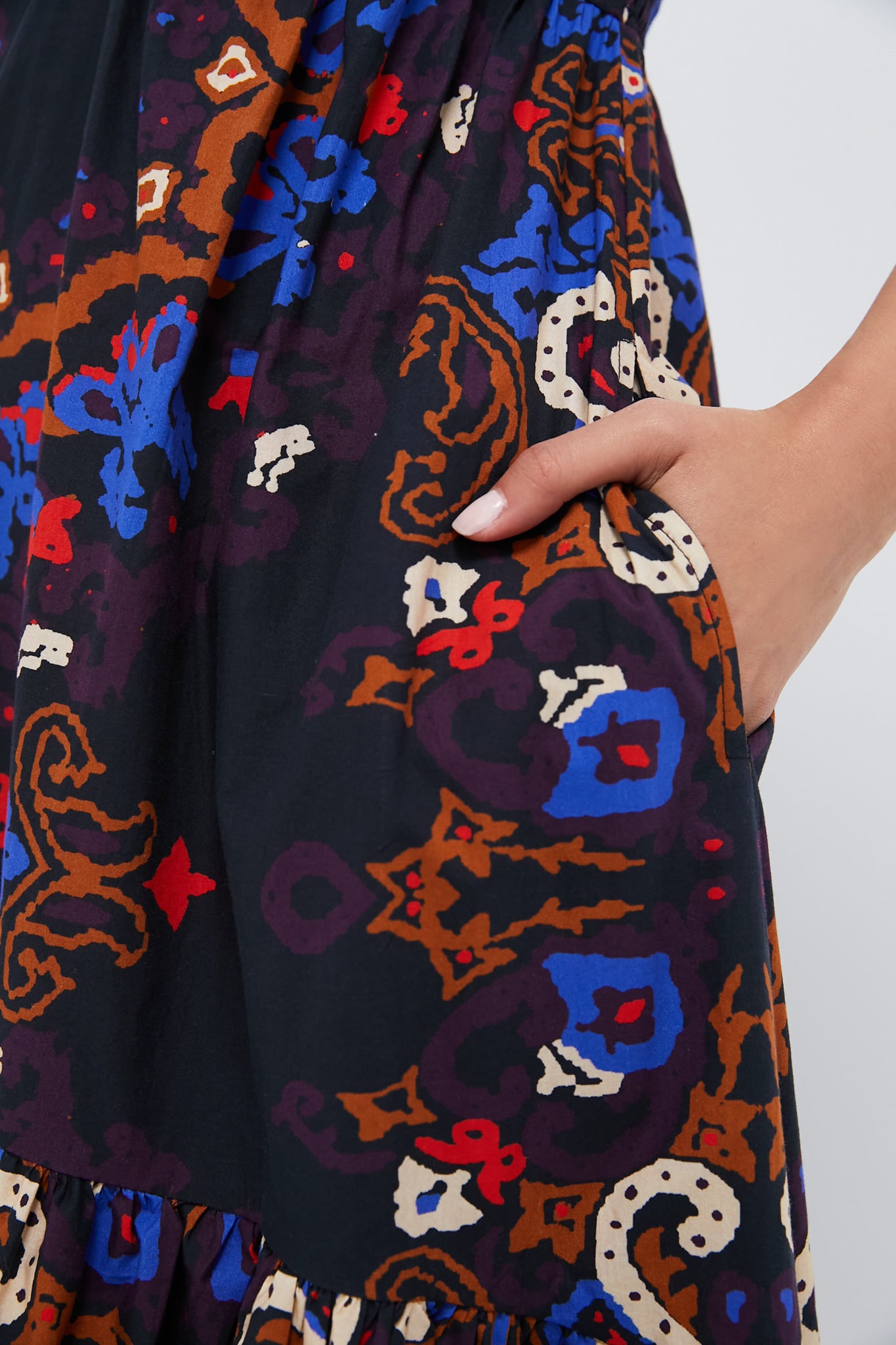 The Venezia Print Jewel Ankle Dress is a piece that has endless options when it comes to styling. Featuring a sweetheart neckline. puff sleeves. and a high-low hem. this number will have everyone's attention. Style for a fall wedding with tie up heels and gold jewelry. or pair with cowboy boots and a wide brim hat for your next trip to the countryside.