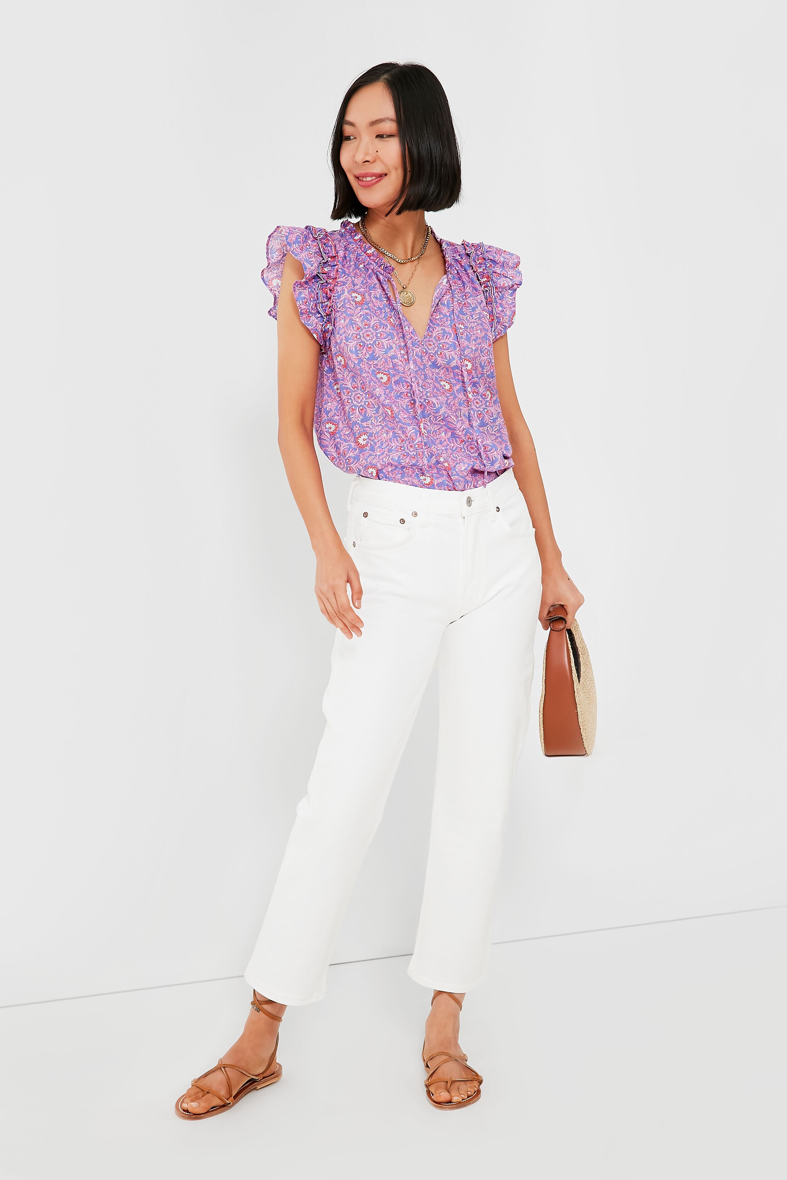 Boho babes. gather round and behold the Violet Katama Tile Ruffle Popover Top. Featuring feminine ruffles. a light and breezy silhouette. and charming neckline ties. this blouse is all about style and versatility — and with that vibrant all-over print. it looks just as good layered under your favorite cardigan as it does on its own. Pair with white denim and your go-to sandals for a sweet off-duty look that can handle all your weekend activities.