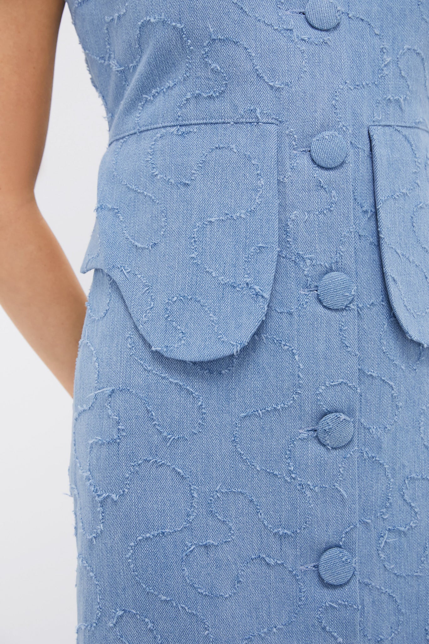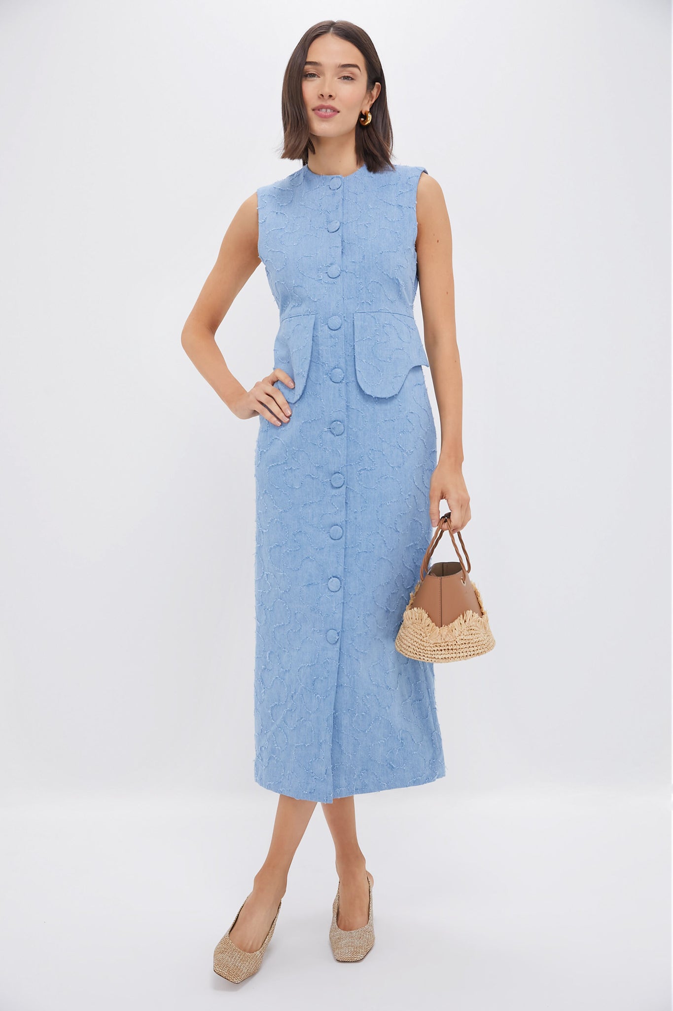 Featuring oversized buttons. textured fabric. and a unique waist detail. this sleek sleeveless midi is ladylike yet fun. Pair with heels for the office and add a raffia tote for events.