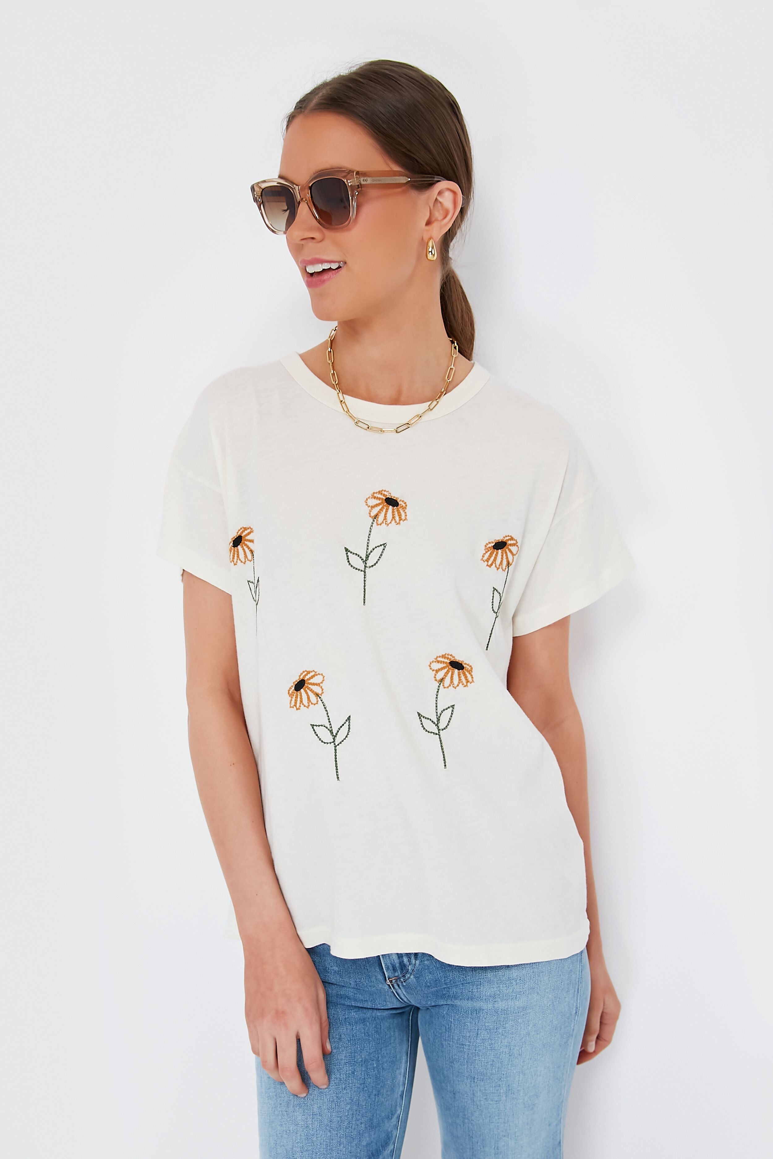 The Washed White Boxy Tee was designed to elevate cherished vintage tops with a throw-on-and-go mentality. With a generous and relaxed cut throughout the body. flattering angled sleeves. and a slightly cropped hem length. this will pair fabulously with everything from jeans to a skirt. Our favorite detail is the charming and whimsical daisy embroidery that makes this perfect for outdoor activities from park picnics to Sunday strolls.