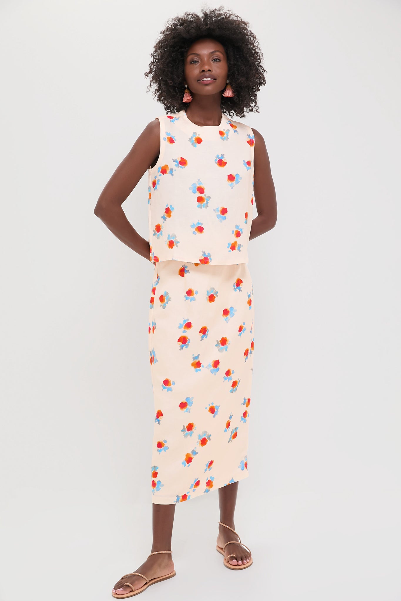 The Watercolor Floral Isla Skirt is a must-have to your warm-weather wardrobe. This midi-length favorite boasts fitted waist with a sleek straight cut. blending tailored structure with a feminine touch. Pair with a white blouse or with the Watercolor Floral Luna Top for a seamless set.