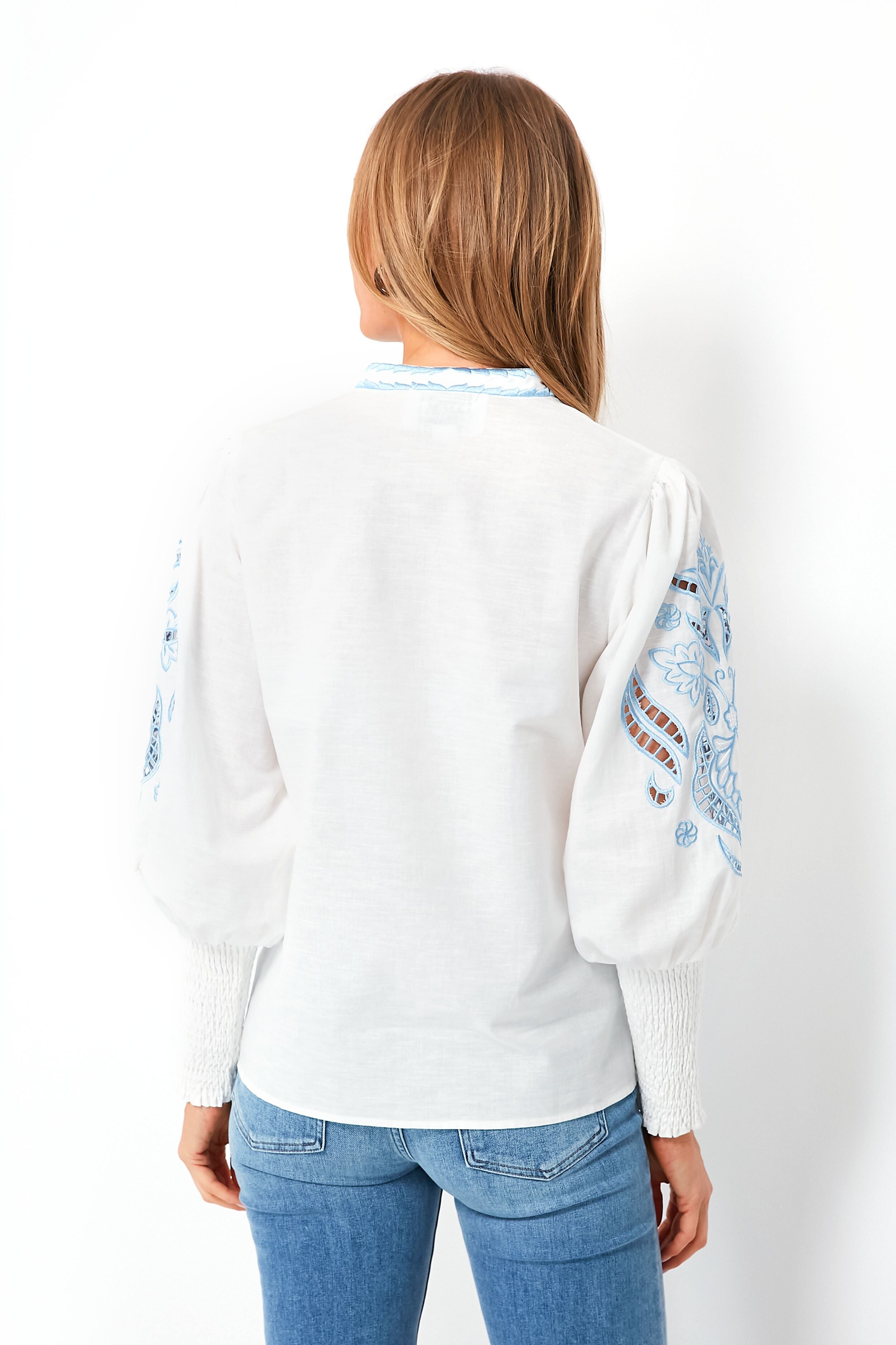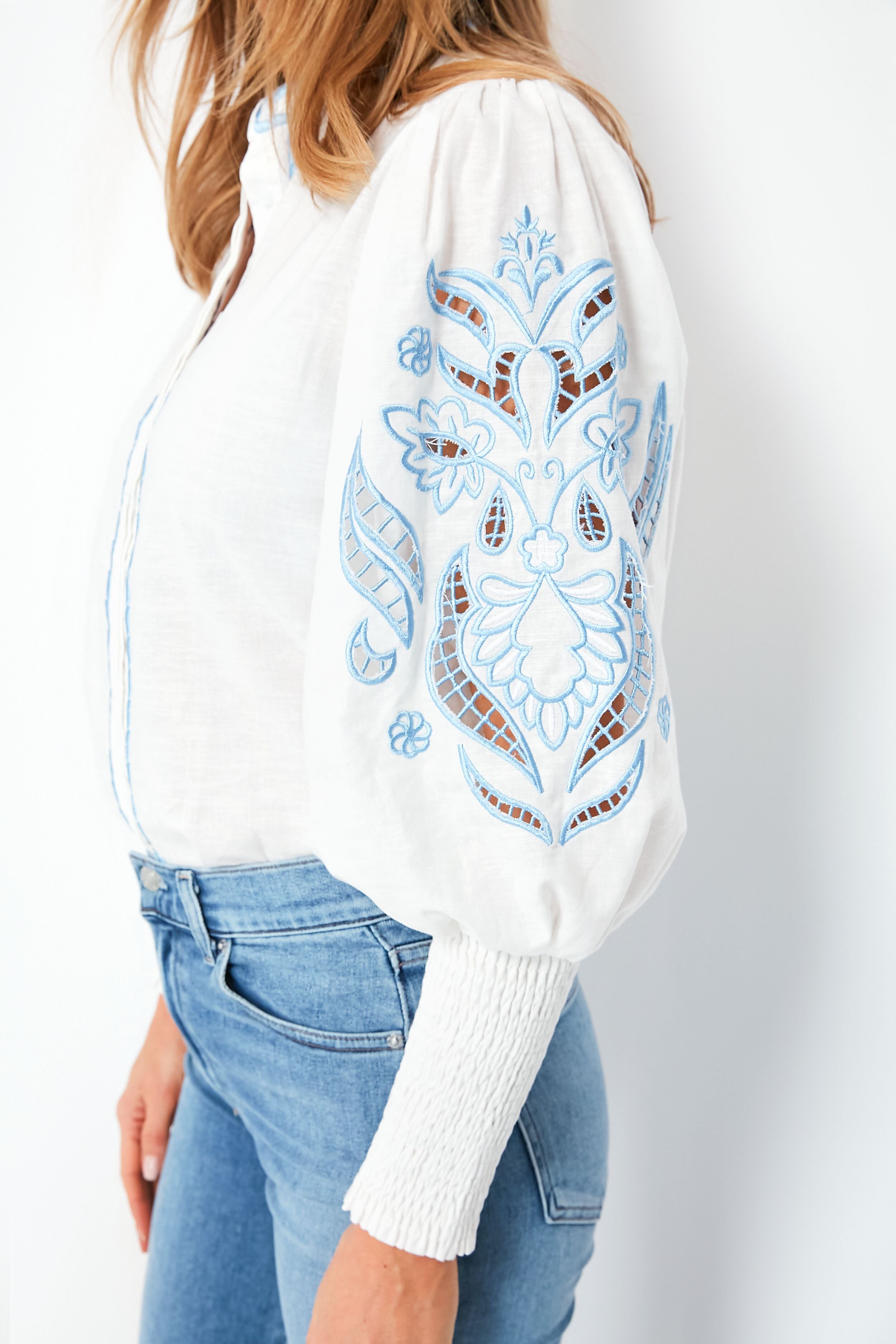 If you know us. you know we love an effortless boho blouse because it looks good anywhere and everywhere. The Sandy Shirt is no different. with its breathtaking cutwork embroidery details atop balloon sleeves and wide smocked cuffs. A button down front placket keeps it classic and timeless. while contrasting blue piping adds a hint of freshness and fun! Pair with denim and sandals for everything from picking up the kids from school to paloma-sipping with the girls.