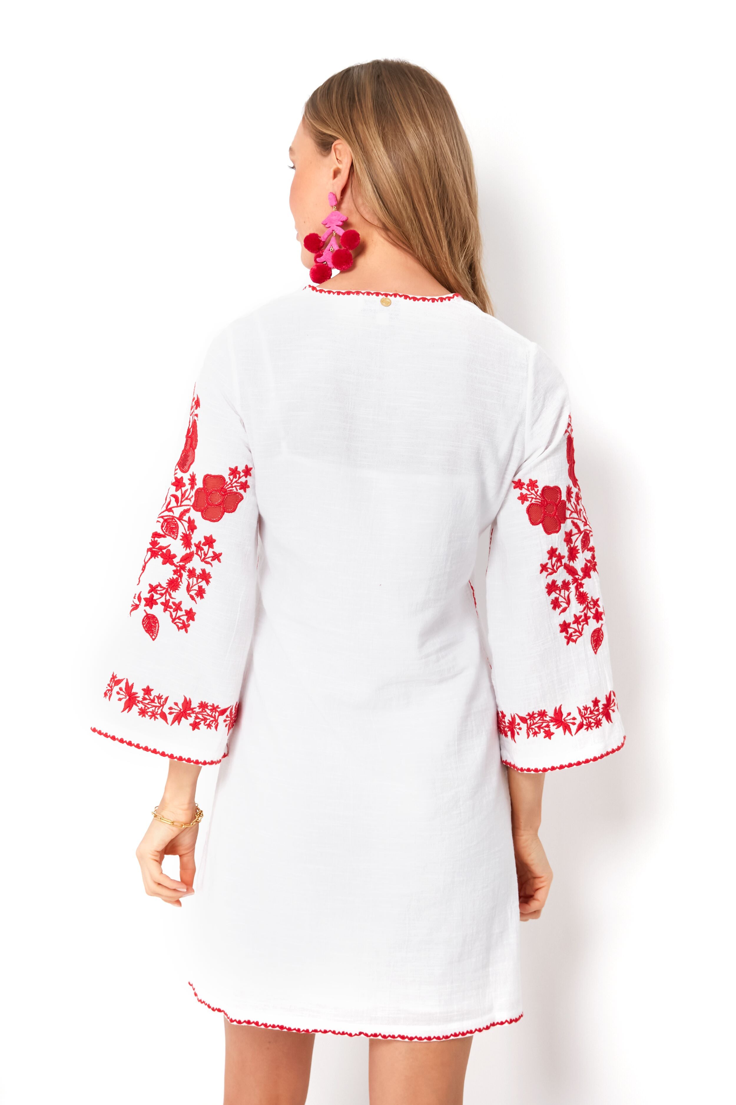 Gorgeous and intricate red hand-sewn embroidery is juxtaposed against the crisp white backdrop of the Vani Dress making for a unique and punchy style. With an A-line silhouette and flared three-quarter length sleeves. this mini ensures you stay cool and covered while braving the summer sun. Accessorize with additional pops of color for a fun and cheery style to boost your mood and look.