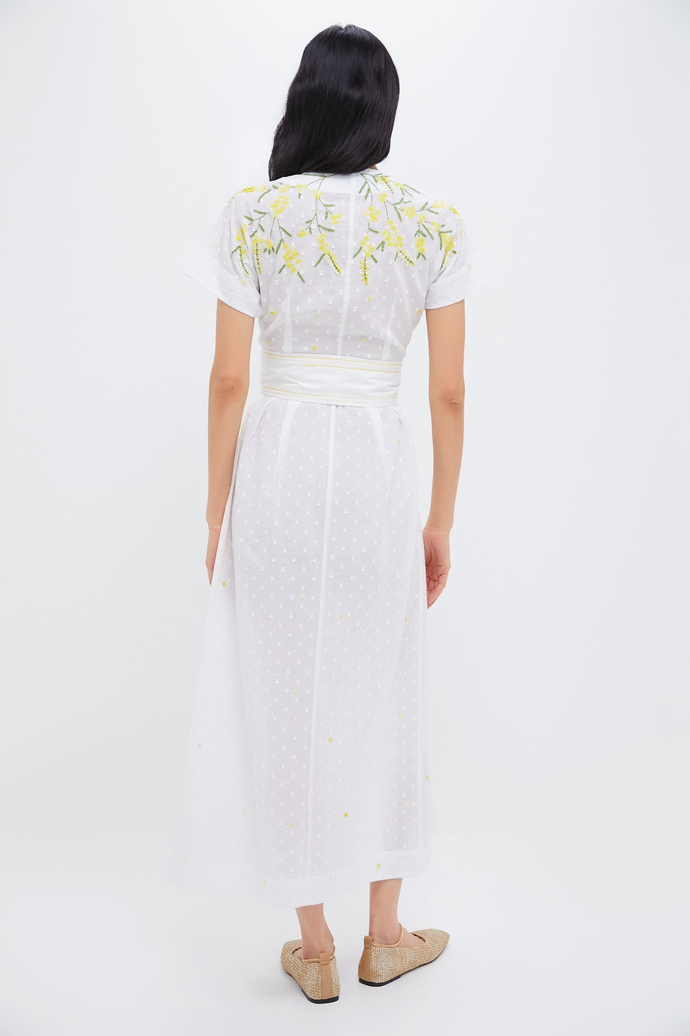 The White and Yellow BB Maxi Dress is crafted from a soft dobby voile entirely hand-embroidered and engineered in a very sophisticated way. Perfect for garden parties. brunch. or vacation strolls. style it with strappy sandals for a sunny. carefree vibe.
