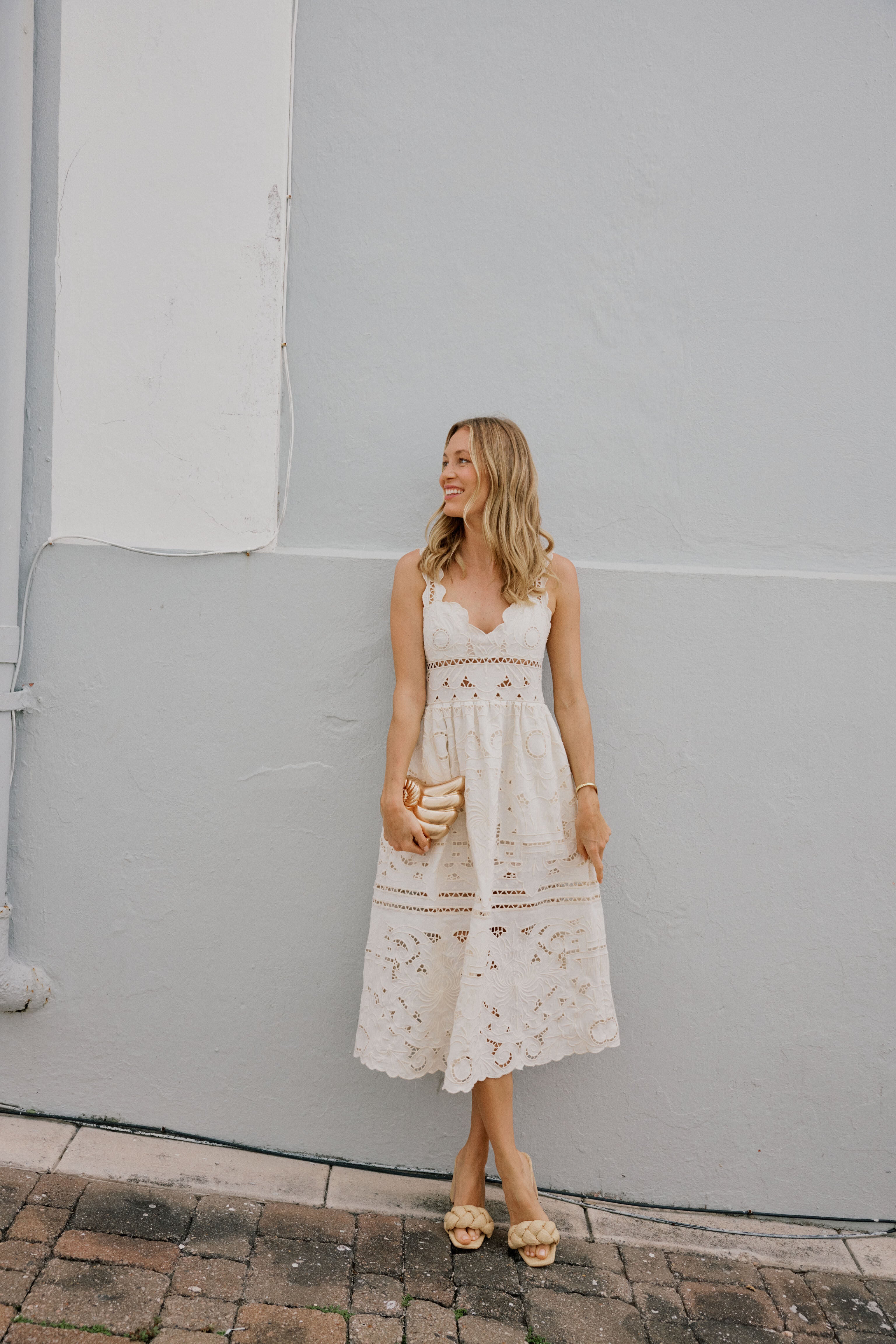 Full of summer appeal and understated glamor. the White Blaire Dress is quickly becoming a favorite of ours. Featuring a flattering yet fitted waistline. a romantic full skirt. and scalloped detailing throughout. this beauty has us feeling like we are up in the clouds. Our favorite details have to be the graceful white hue and charming. see-through eyelet detailing. perfect for an outdoor wedding or garden tour. Style with lace-up flat sandals. gold jewelry. and a metallic shoulder bag for a breathtaking look.