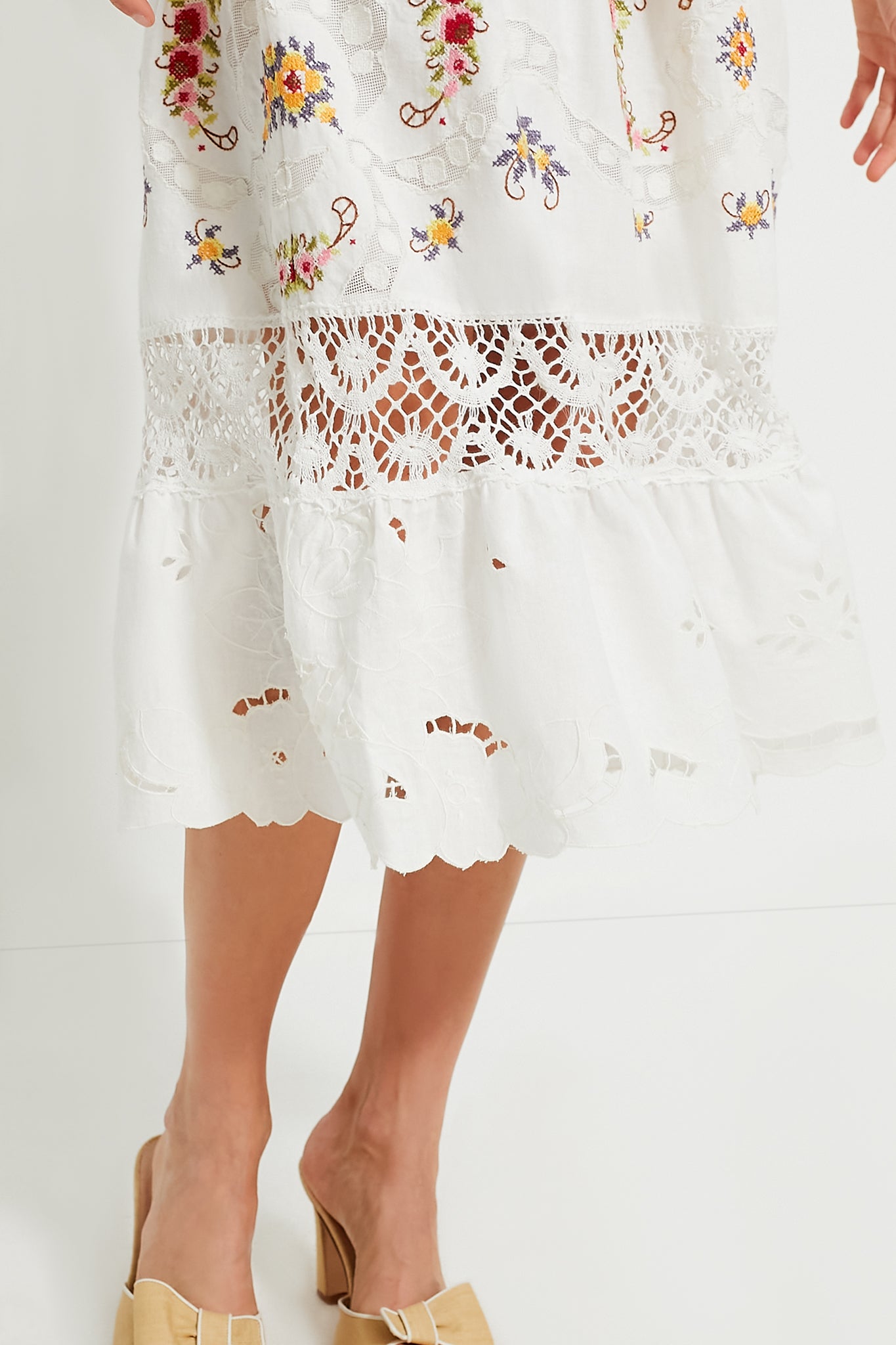 The White Edwina Embroidery Sleeveless Dress is an ethereal style that can be worn over and over again. This midi features colorful cross stitch embroidery throughout. lace trim detailing. and an eyelet ruffle hem. Pair with sandals and a shoulder bag for grabbing brunch with the girls. or with heels and a clutch for an outdoor cocktail event.