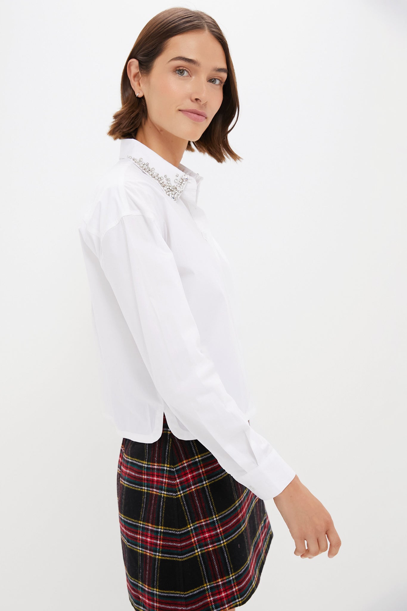 A chic white shirt goes for miles in your wardrobe and this Embellished Jasper Button Down is no exception. Polished details like a crystal double-fused collar. scalloped side slit. and fitted button cuffs make this cropped silhouette a styling winner! For business or pleasure. wear it tucked or loose. this effortlessly polished piece is great for year round wear thanks to its versatile styling options.