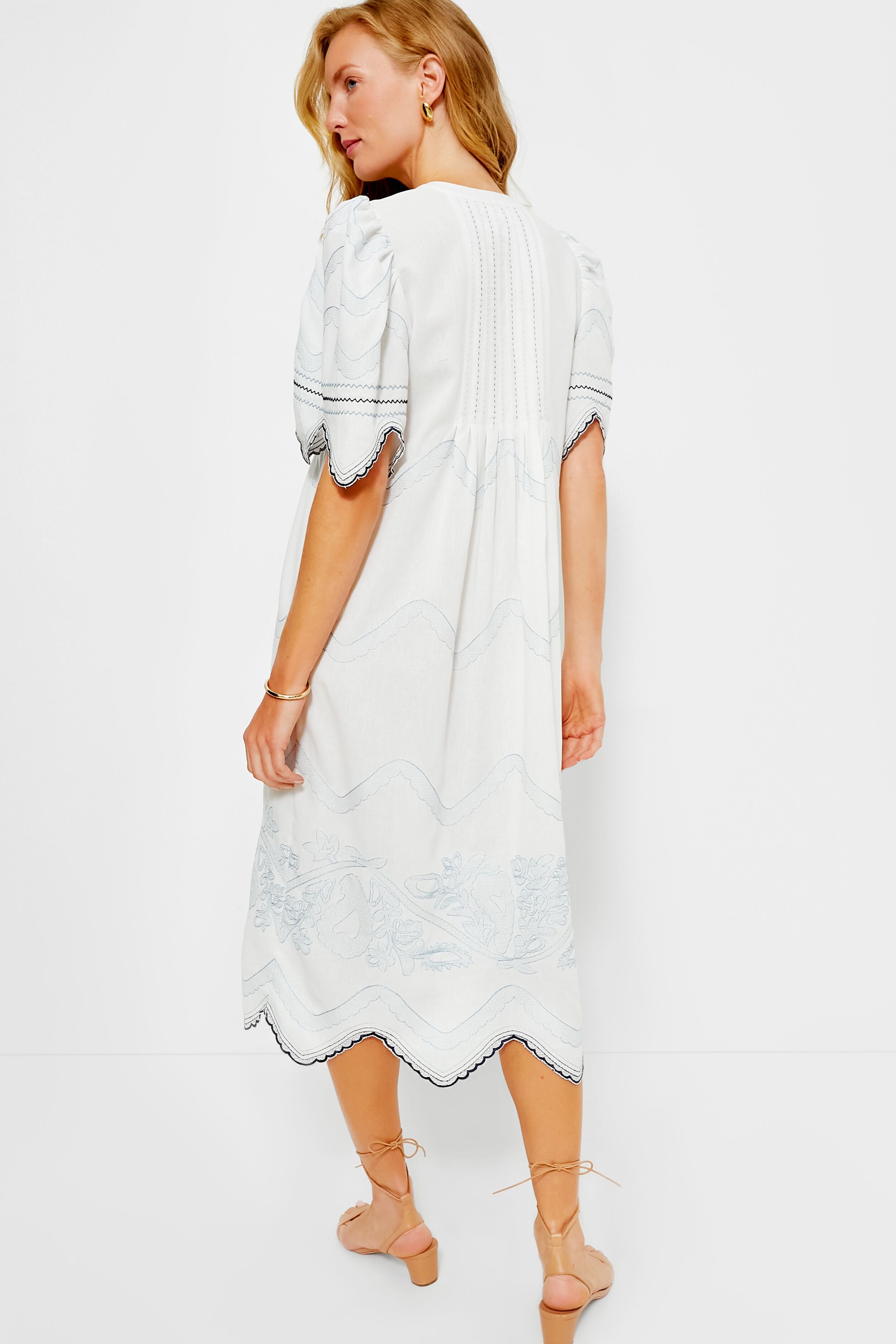 We are loving the elegant White Weston Midi Dress for its elevated details and versatility. The relaxed silhouette boasts zig zag trim. embroidered detailing. and short bell sleeves. As comfortable as it is chic. we are pairing this with neutral heels and a clutch for dinner parties. or with sandals and a tote for casual weekends.
