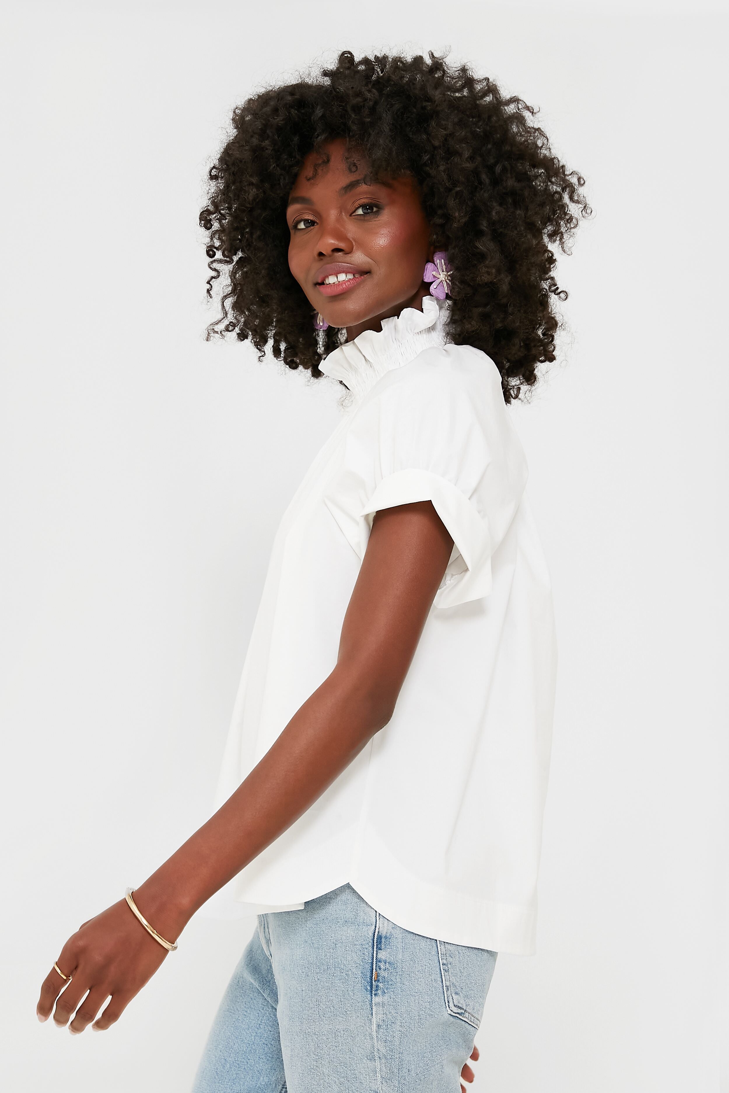 Add a dash of contemporary style to the everyday with the White Franka Top. It features a relaxed. comfortable fit. as well as short puff sleeves finished with thick cuff bands. and a stand-up ruffle collar to add a bit of drama. Pair with trousers and heels for a chic office look. or tucked into denim to go casual.