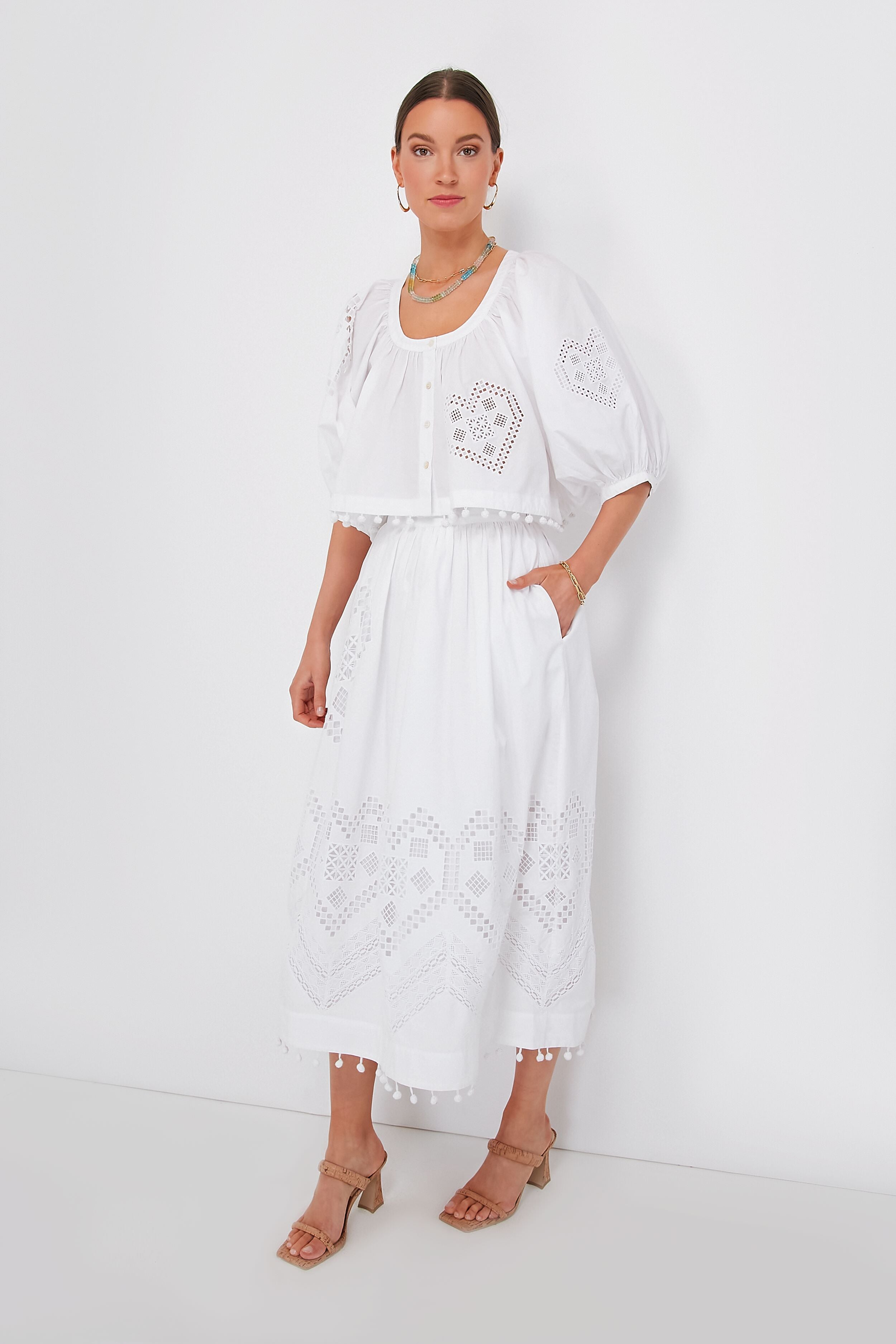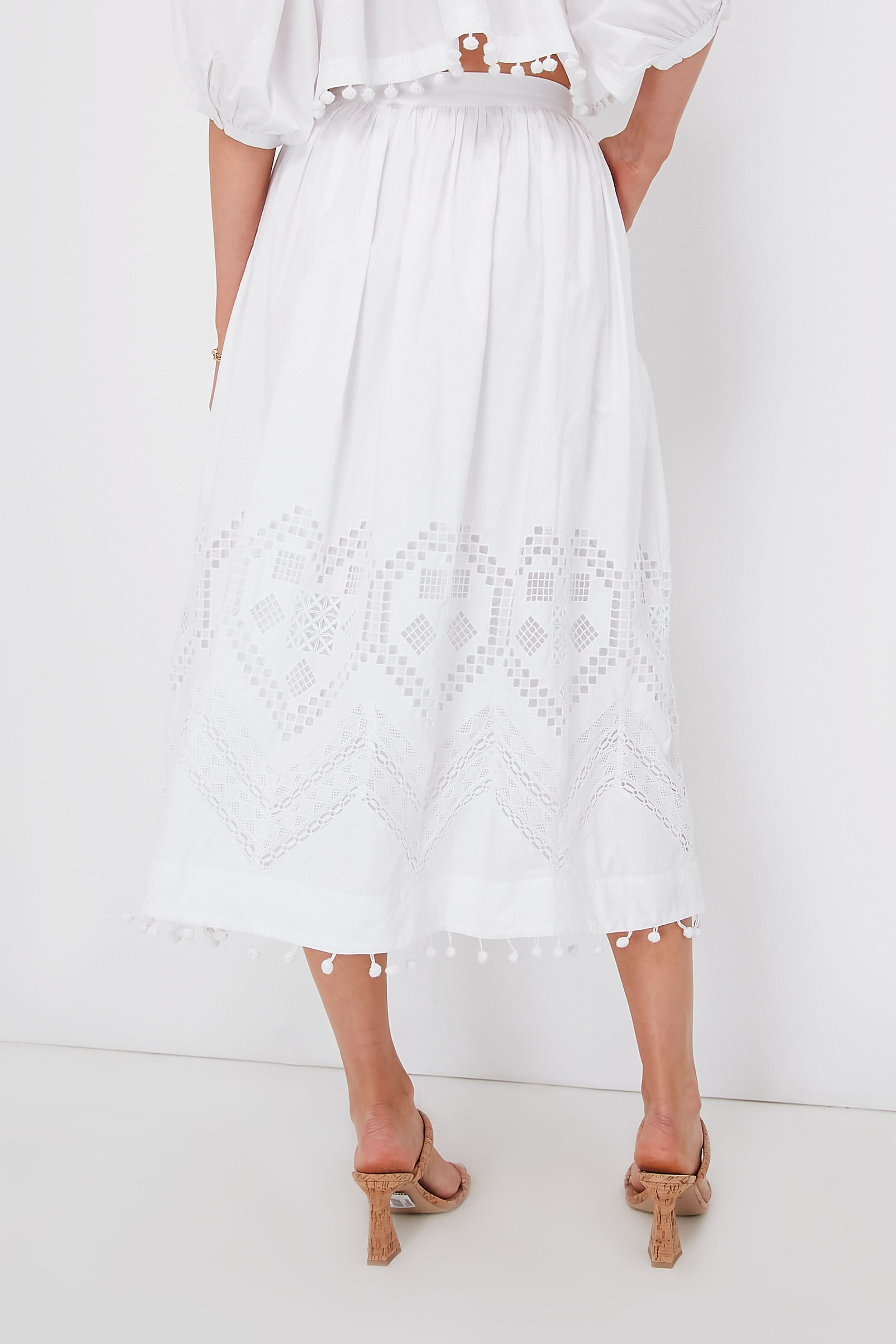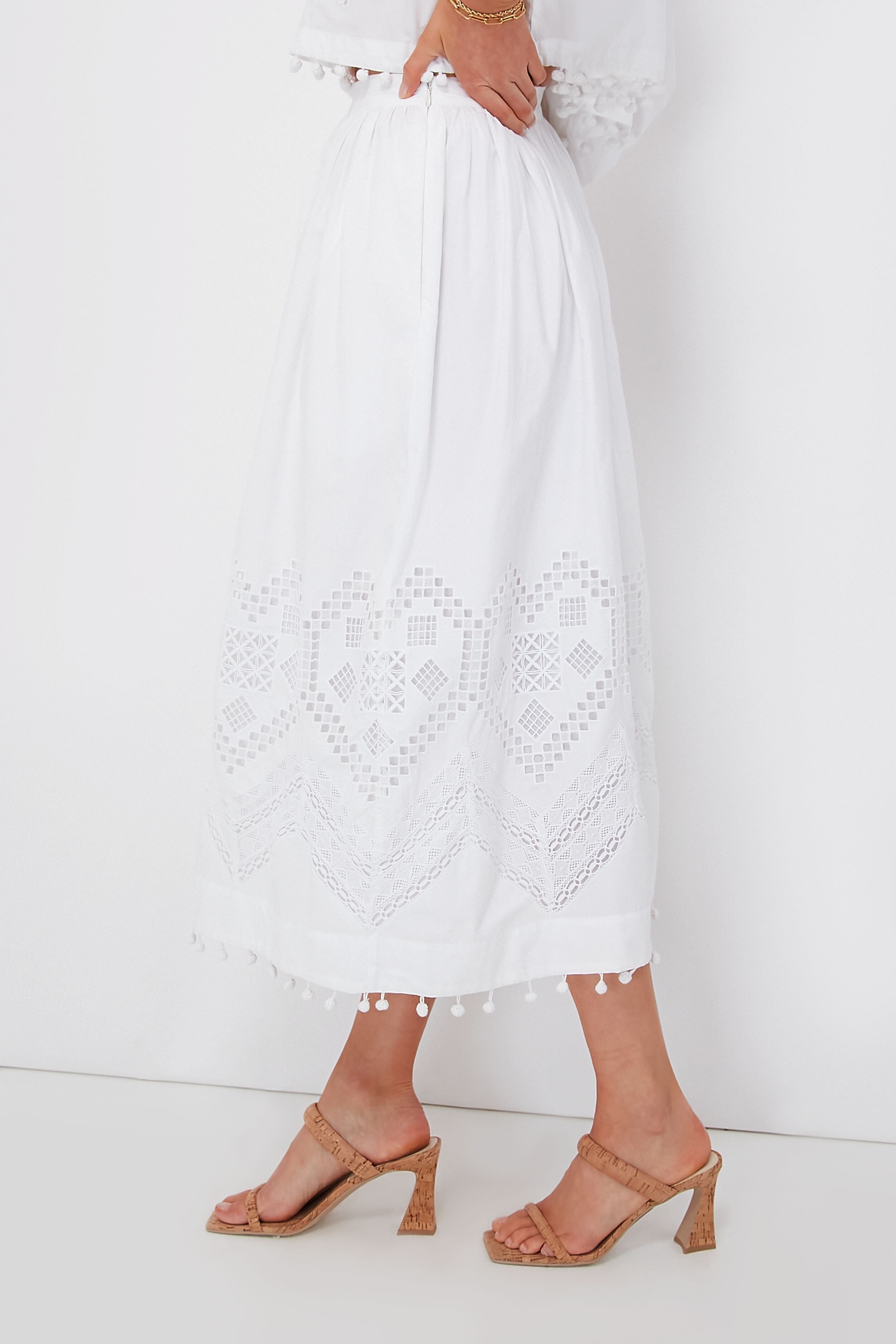 Drawing inspiration from classic bohemian silhouettes. the White Eyelet Malaya Skirt features a banded waist. side seam pockets. and heart designs in cutout embroidery. A pompom trimmed hem brings a little bit of extra fun to this midi. making it an excellent choice for a daytime dates. baby showers. vacations and more. Pair it with the matching crop top for a breezy and romantic look. then add strappy sandals and gold jewelry for an ultra-stylish yet effortless outfit.
