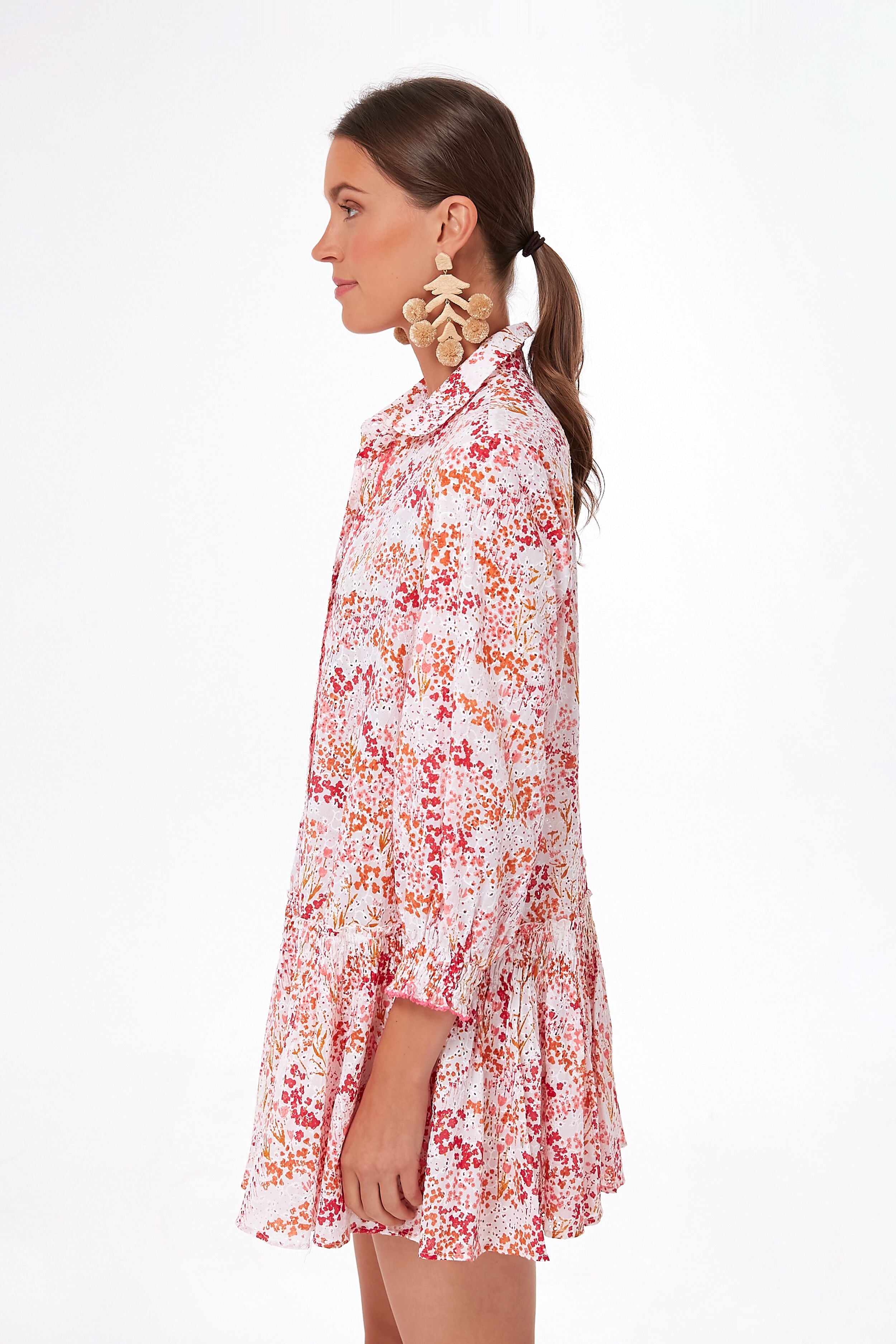 Take your go-to shirtdress on vacation with the White Pink Tulipe Tesorino Dress. Designed for a loose fit in a mini length. this breezy number is just begging to be taken on a warm-weather getaway. A rounded collar. ruffle cuffs. scalloped trim at the placket. and a dropped waist all add to the delicate femininity of this silhouette. A bright ditsy print completes this too-good-to-be-true style that we know you will love. Wear it unbuttoned over a swimsuit with your favorite floppy hat. or buttoned up with sandals for happy hour at the beach bar.