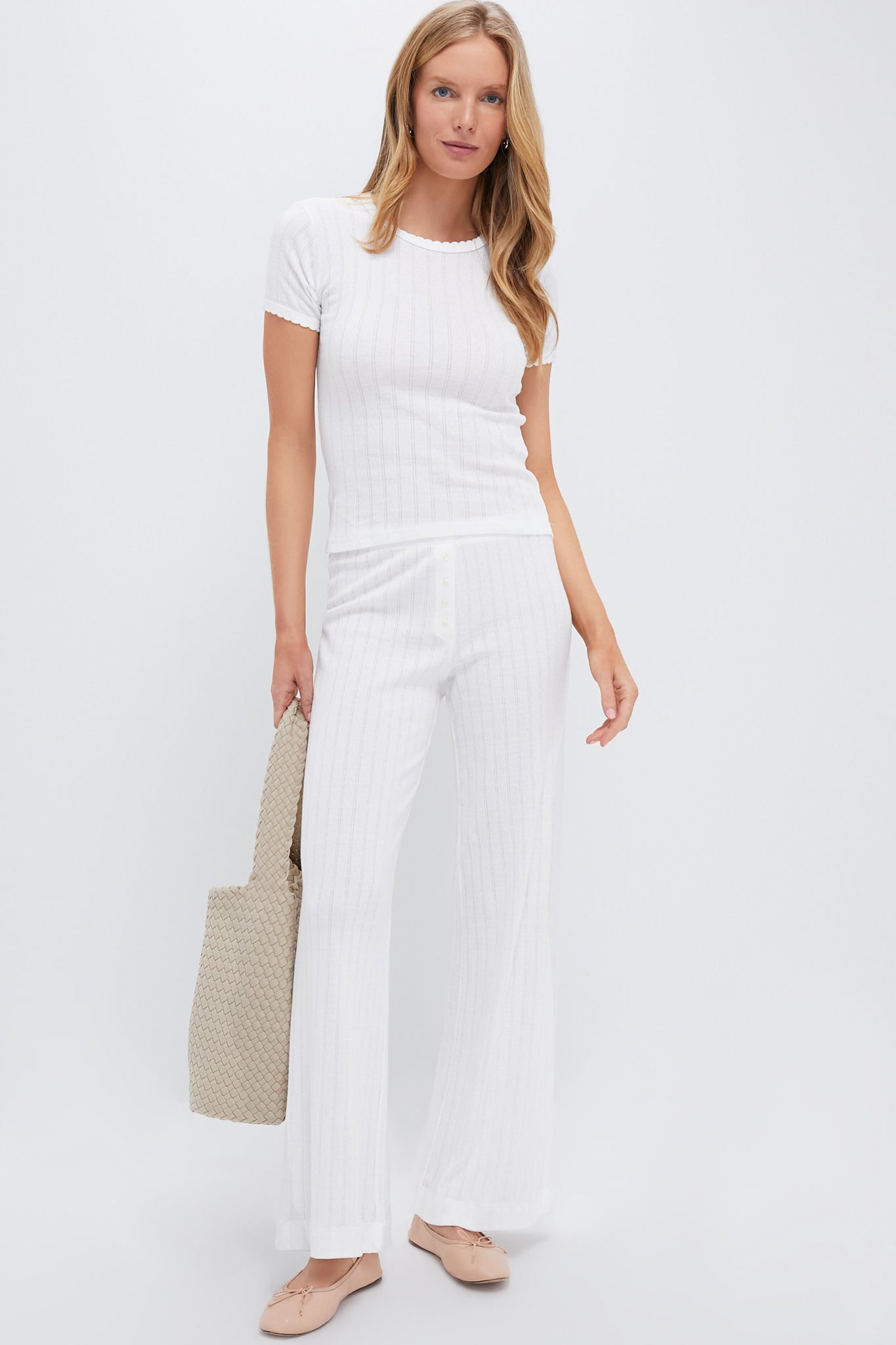 The White Pointelle Boxer Pant is a relaxed. wide leg silhouette. featuring pinhole stripes. dainty eyelets. henley buttons and a comfortable elasticized waistband that sits at the natural waist. From chic airport looks. to lounging around the house on a dreary Sunday. to grocery store runs. pair it with the matching White Pointelle Slim Fit Tee for the perfect girl-on-the-go look all year long.