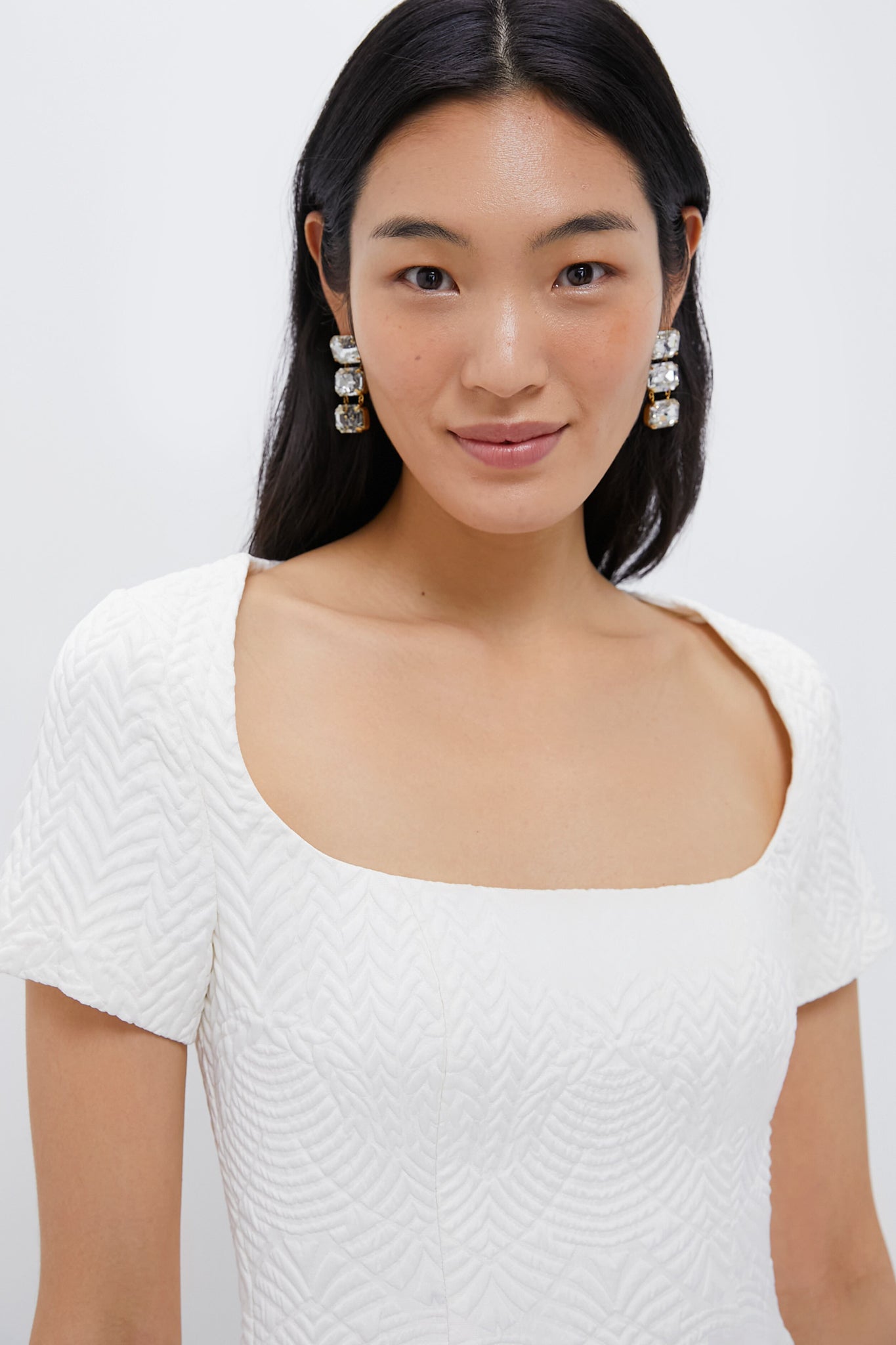 The Priscilla Mini Dress is a charming blend of elegance and playfulness. crafted from a luxurious textured jacquard fabric. Featuring a flattering square neckline and cute cap sleeves. this fully lined dress offers a feminine silhouette that's perfect for any occasion. We styled it with fun colored heel and silver jewelry and clutch!