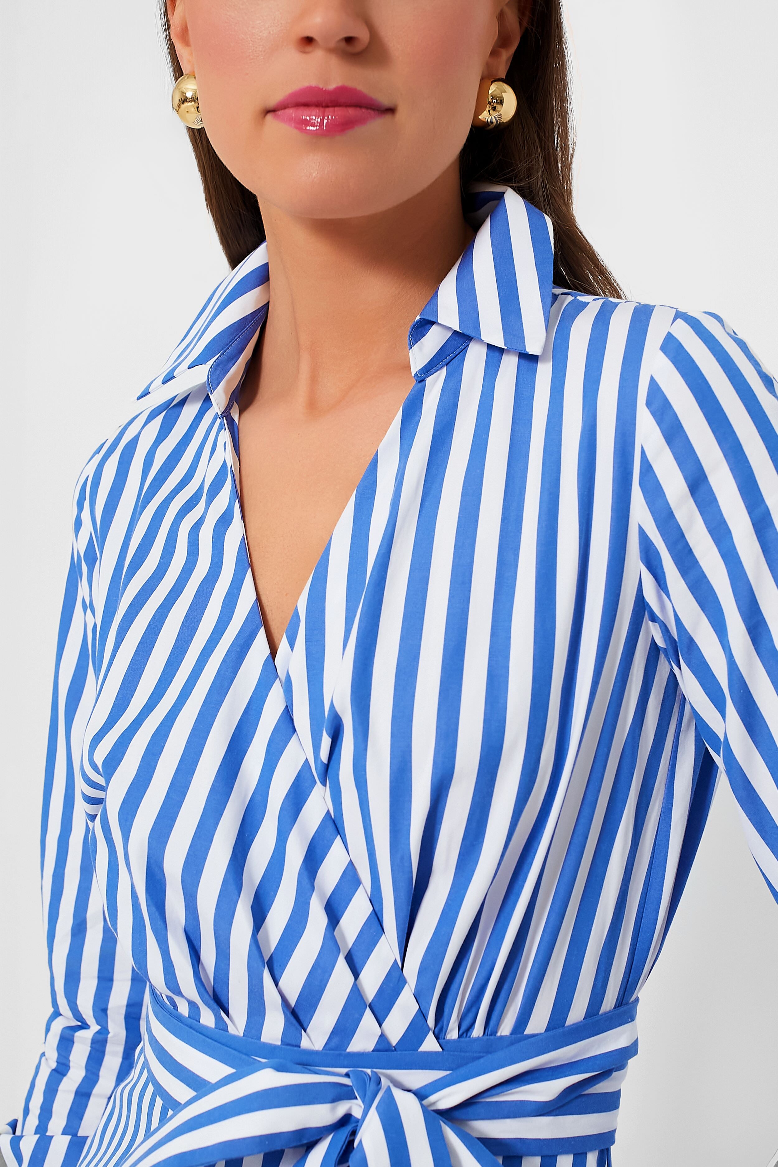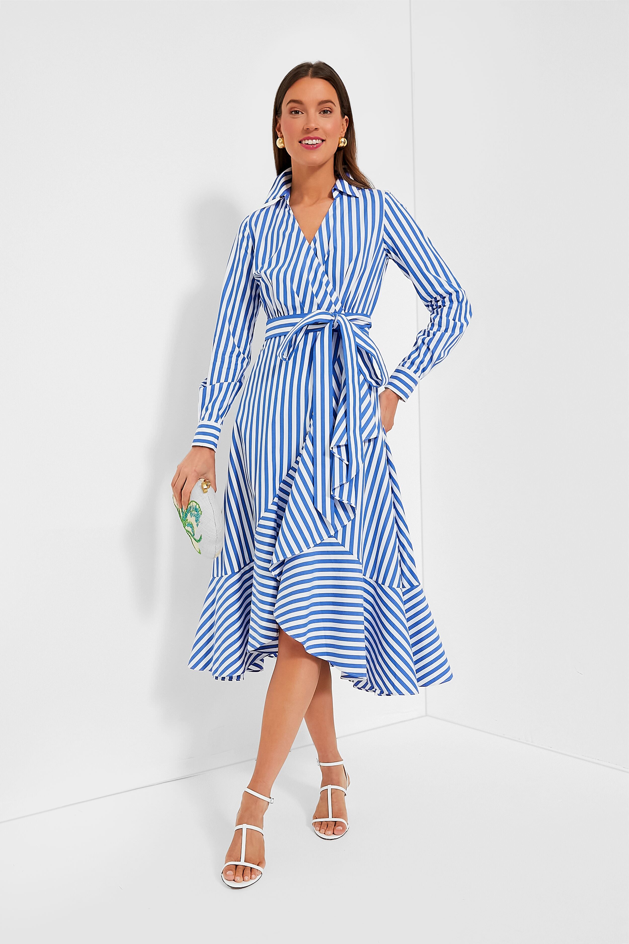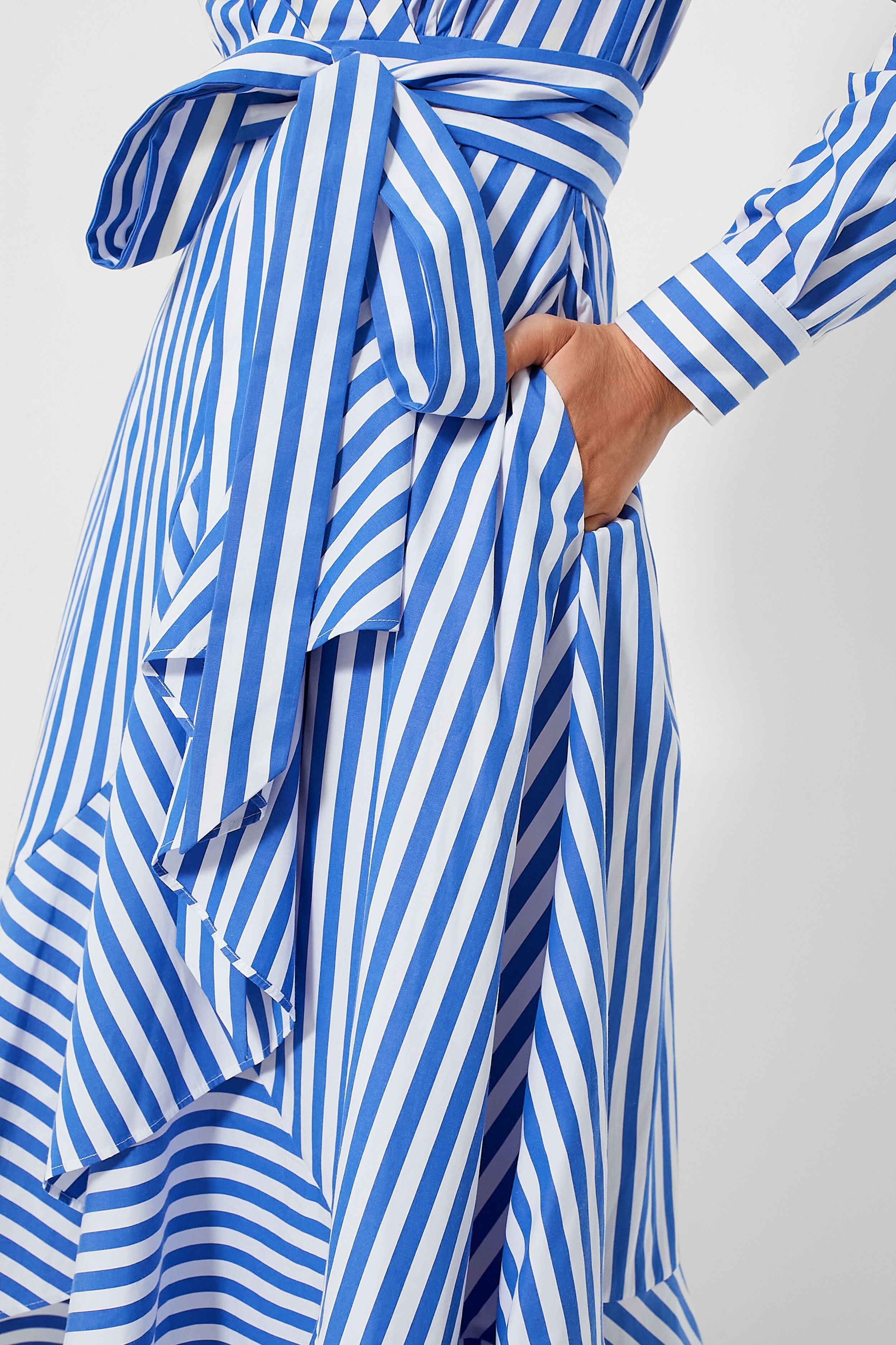 Get dressed in a flash with the Wild Blue Iris and Fresh White Julia Stripe Wrap Dress. Made from lightweight striped poplin. this easy. breezy number features surplice neckline. self-tie waist belt. pretty ruffle accents which instantly make us love it more. and slits up the hem that promote effortless movement. Made for slipping into any event or soiree. this beauty just needs to be paired with some heels and a clutch for a complete look!