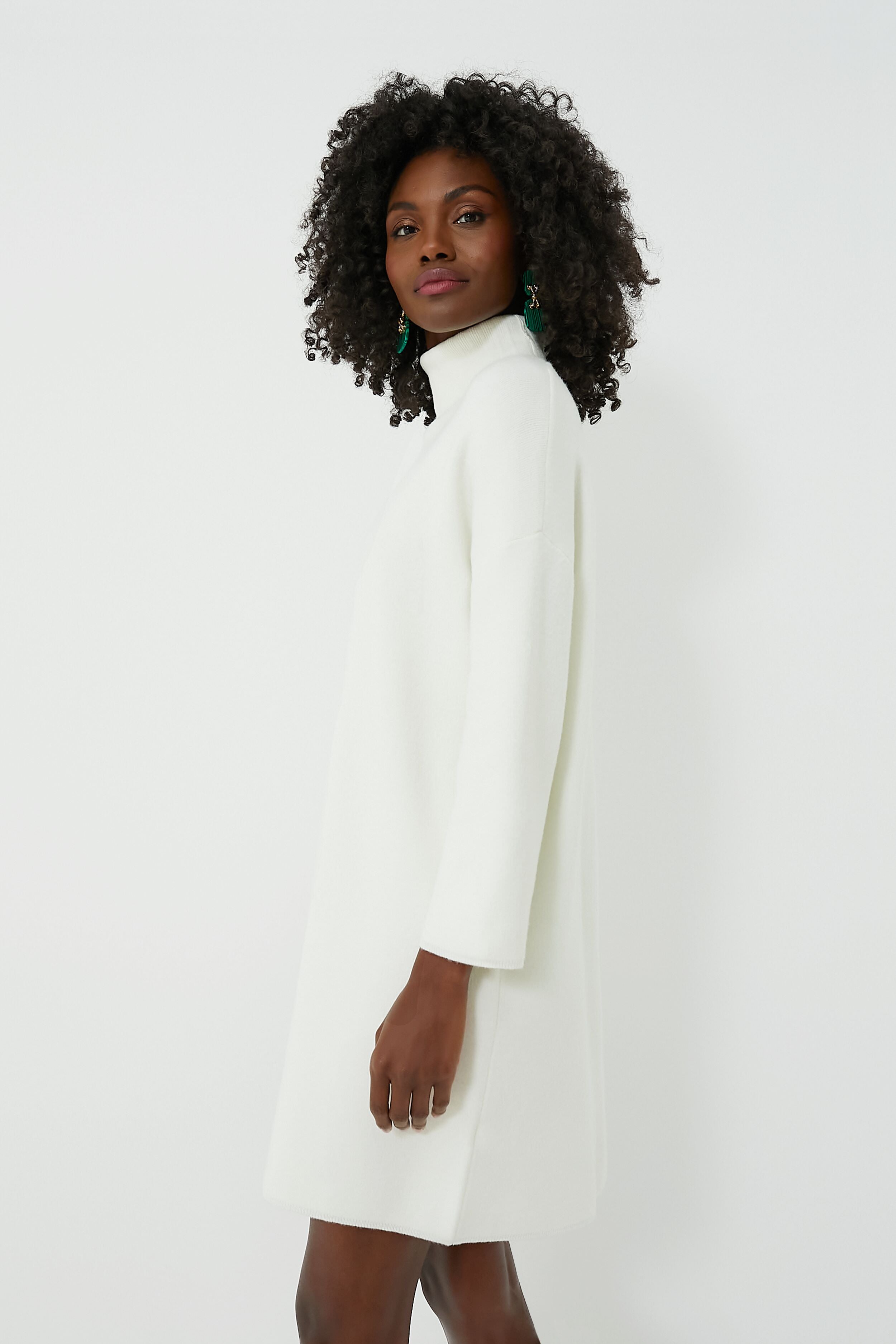 Meet the newest addition to your cold weather wardrobe- the Winter White Vivianne Dress. This mod-inspired silhouette wears well from school drop-offs to meeting friends for drinks with its cozy fabric. turtleneck detail. and a mini but not-too-short length. Pair with sneakers and a light jacket for a playful daytime look and switch to boots and statement jewelry for a chic but cozy night out.