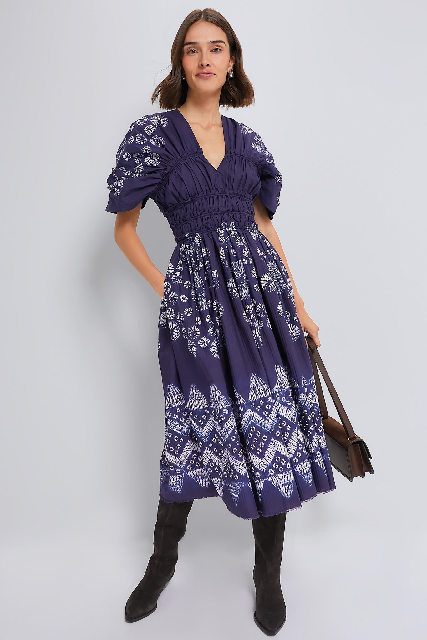 The Yana Dress is a feminine silhouette featuring oversized draped sleeves. a deep v-neck line. elastic cording at the waist. and pleated detailing and raw edge hemline. We are styling it with heels and a clutch for cocktail parties and boots and a shoulder bag for friend get-togethers.