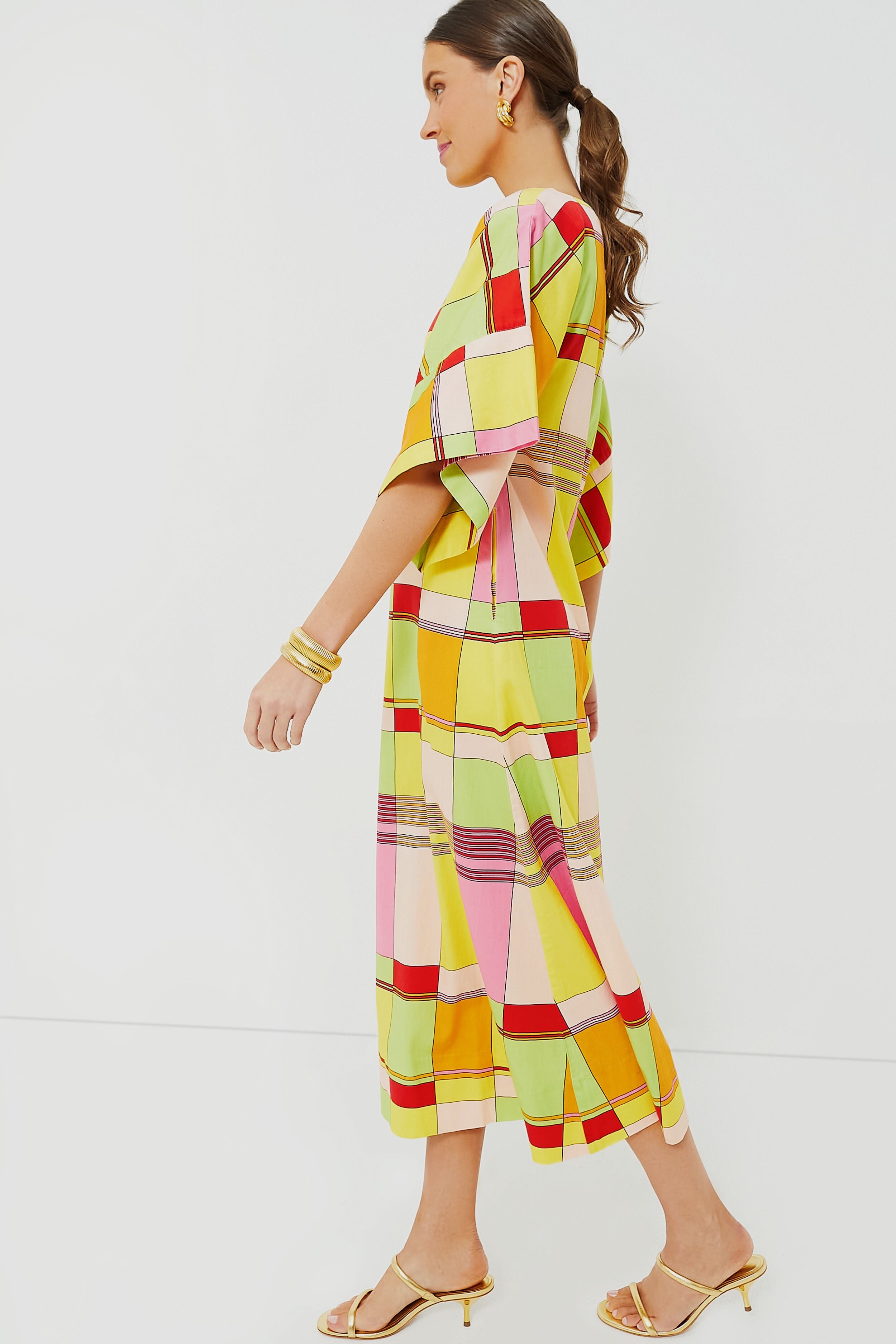 We can already picture the ultra-glam Yellow Colorblock Plaid Spinnaker Dress blowing in the warm breeze. Inspired by the lightweight. brightly-colored fabric used for sails. this flowy maxi has elegant details like a boat neckline. short batwing sleeves. and a roomy fit with a beautiful drape. An elevated caftan-like style. this number evokes joy and is perfect for vacations — pack it down tiny to fit it in your suitcase. then throw it over your swimsuit for drinks by the pool or try it with heels and a clutch for dinner al fresco.