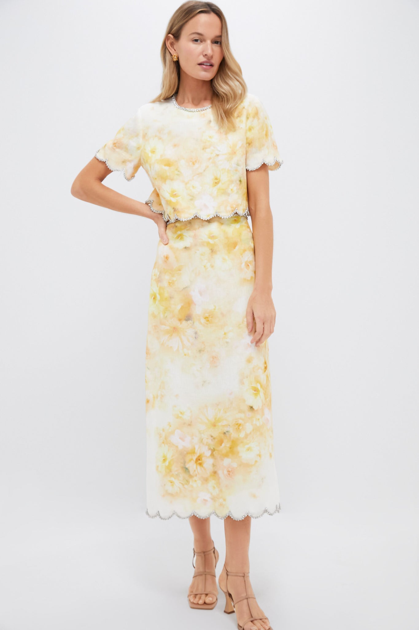 The Yellow Floral Crush Scalloped Top is defined by its unique scalloped hemline and crystal edges on the hemline and sleeves. Featuring a boxy fit. cropped length. and zip closure at the center back. this ultra flattering top is perfectly paired with the Crush Scalloped Midi Skirt. heels. and a clutch!